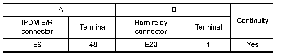 3. Check continuity between IPDM E/R connector and horn relay connector.