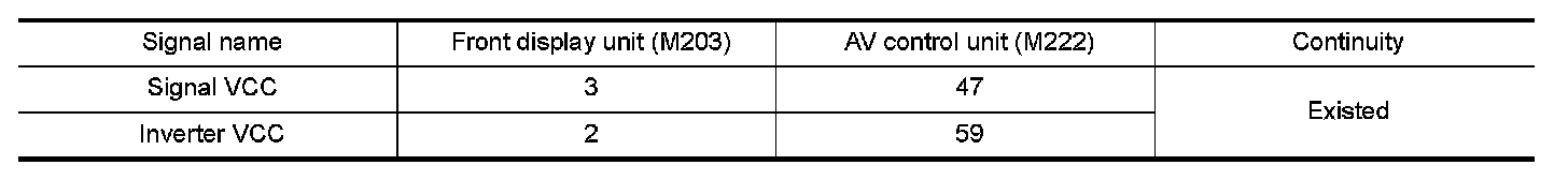 3. Check continuity between front display unit harness connector M203 and AV control unit harness connector M222.