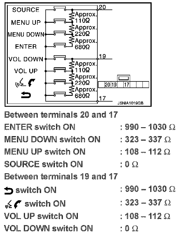 Measure the resistance between the steering switch connector terminals 20 to 17 and 19 to 17.