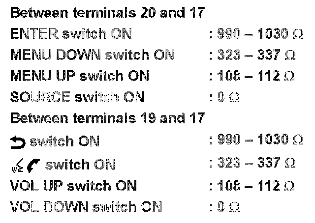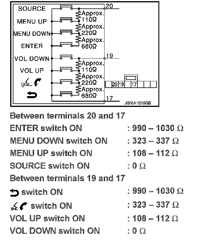 Measure the resistance between the steering switch connector terminals 20 to 17 and 19 to 17.