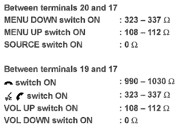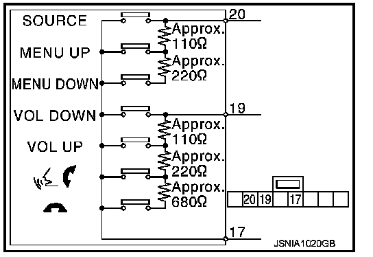 Measure the resistance between the steering switch connector terminals 20 to 17 and 19 to 17.