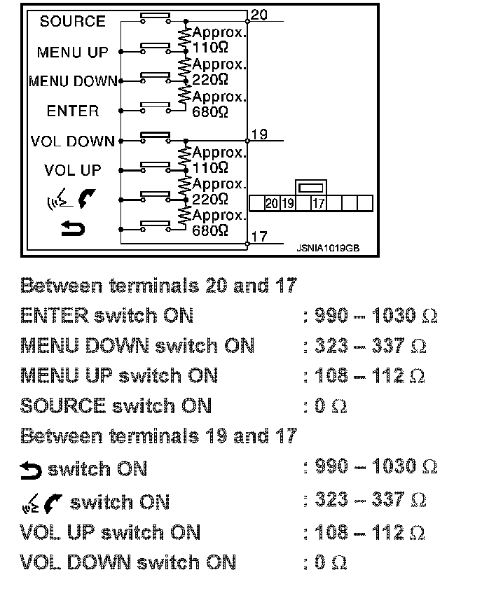 Measure the resistance between the steering switch connector terminals 20 to 17 and 19 to 17.
