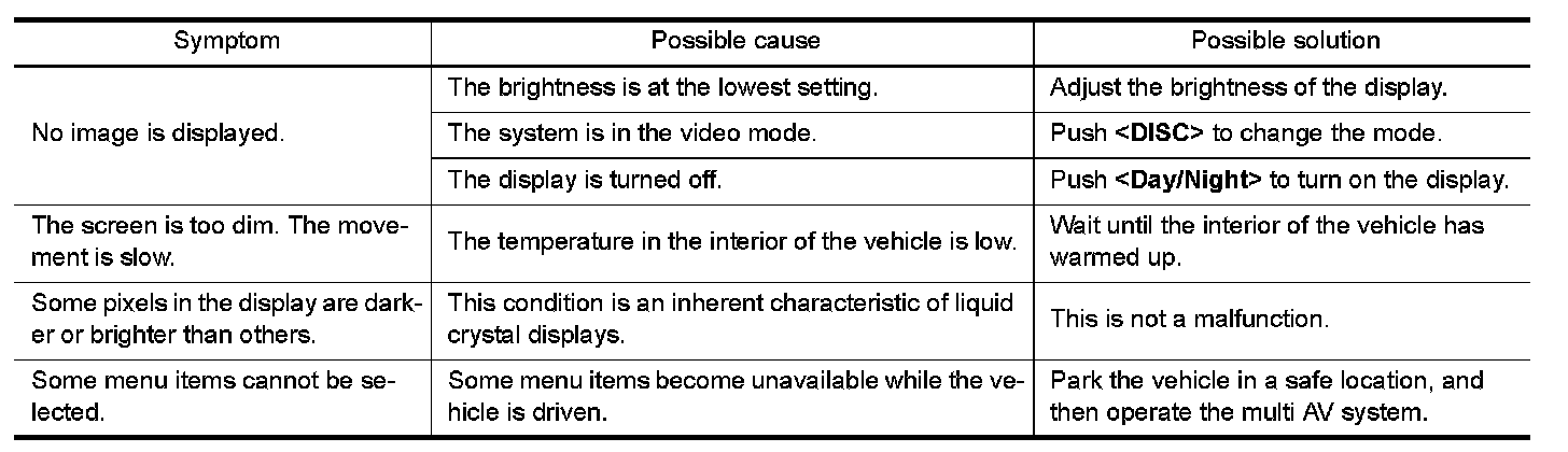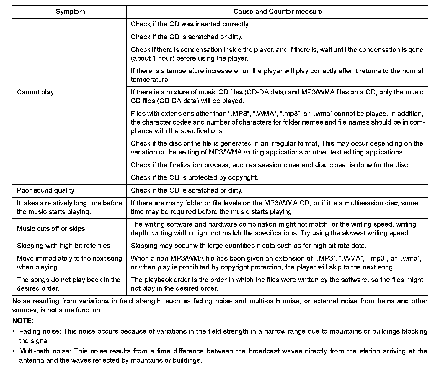 - The majority of the audio malfunctions are the result of outside causes (bad CD/cassette, electromagnetic interference, etc.). Check the symptoms below to diagnose the malfunction.