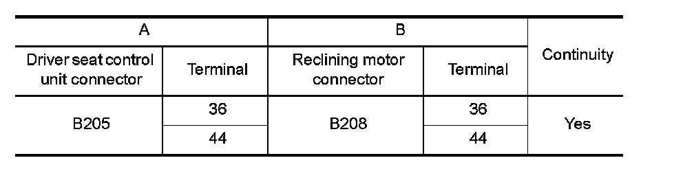 3. Check continuity between driver seat control unit connector and reclining motor connector.