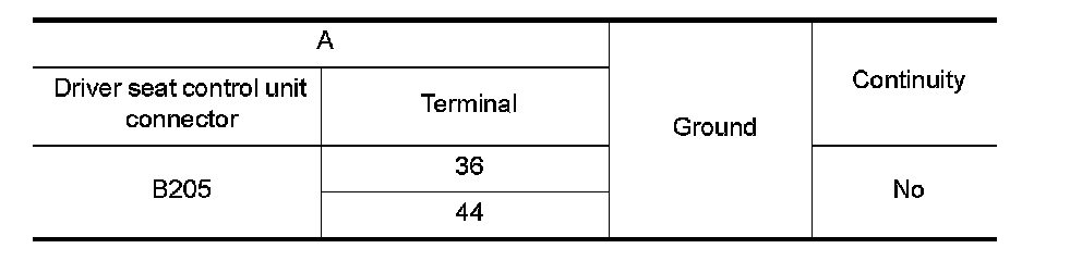 4. Check continuity between driver seat control unit connector and ground.