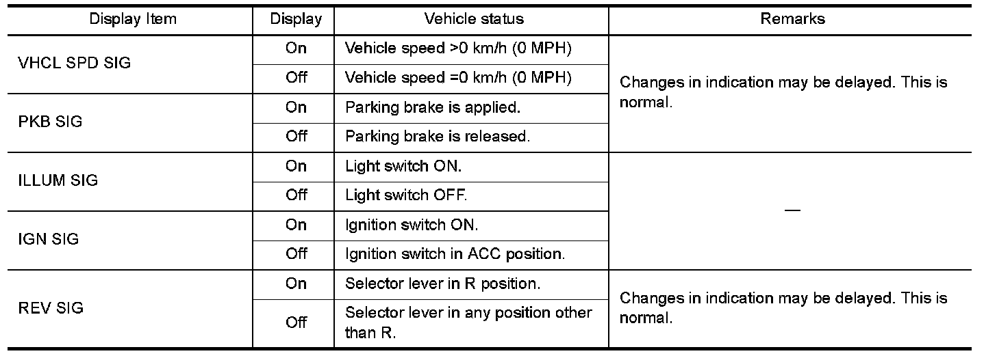 - Displays the status of the following vehicle signals inputted into the AV control unit.