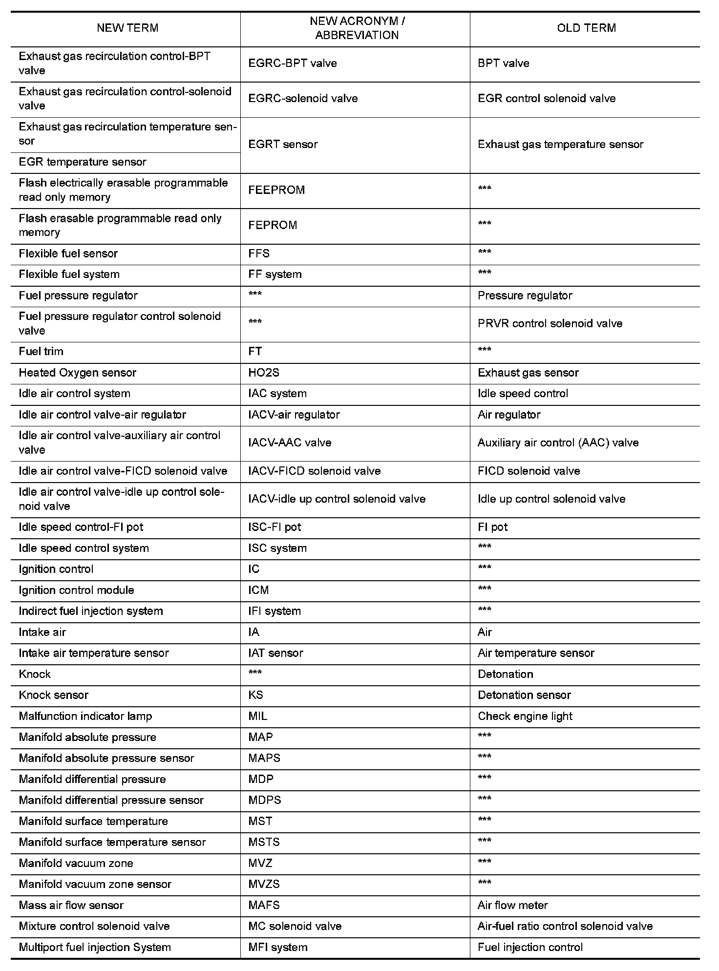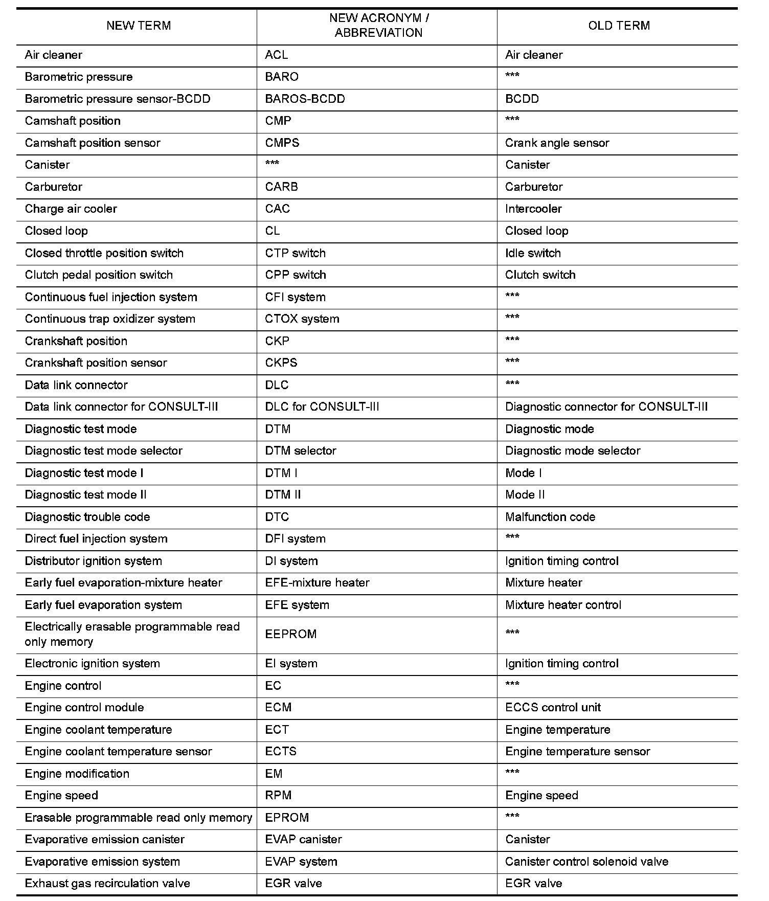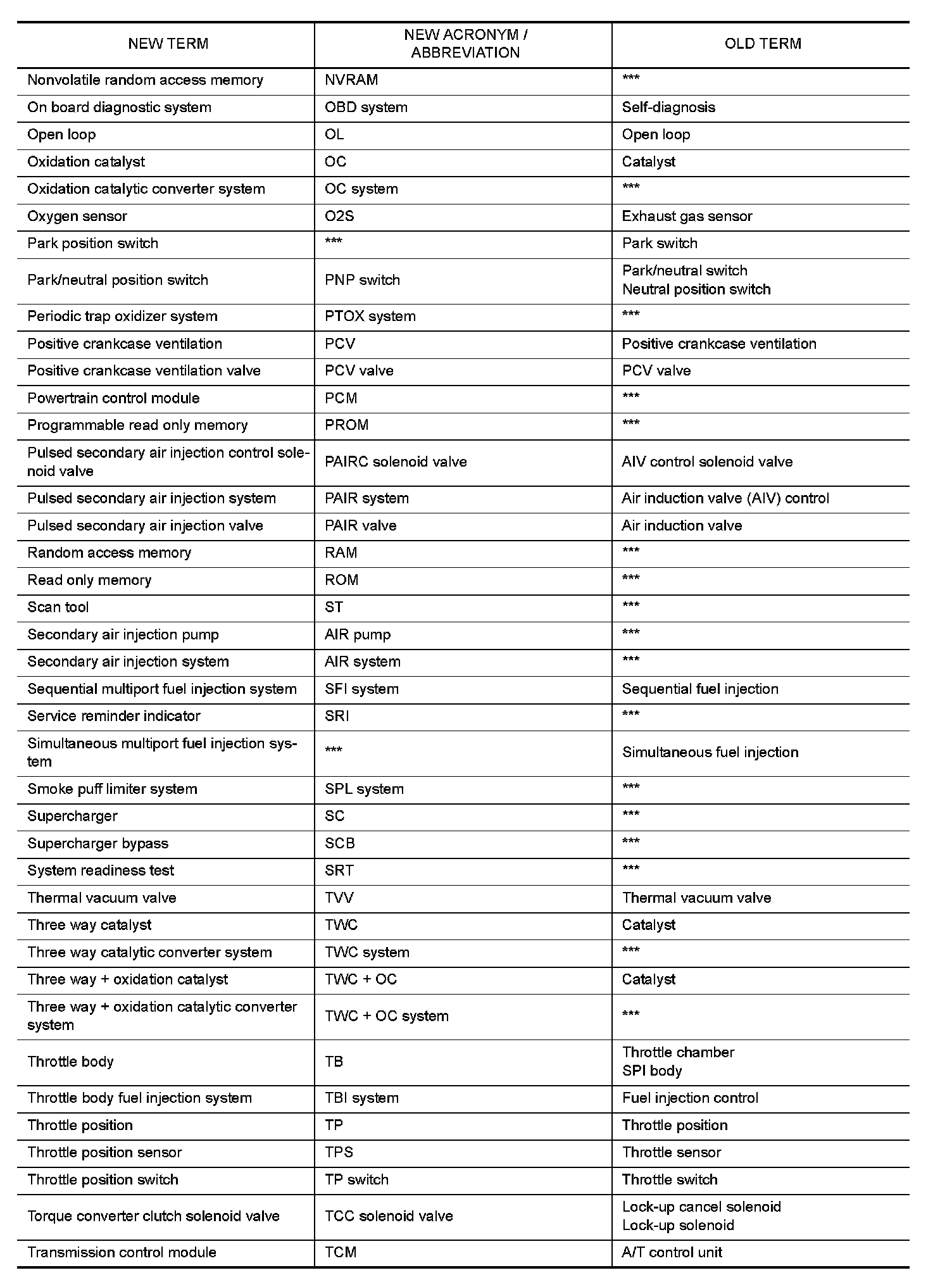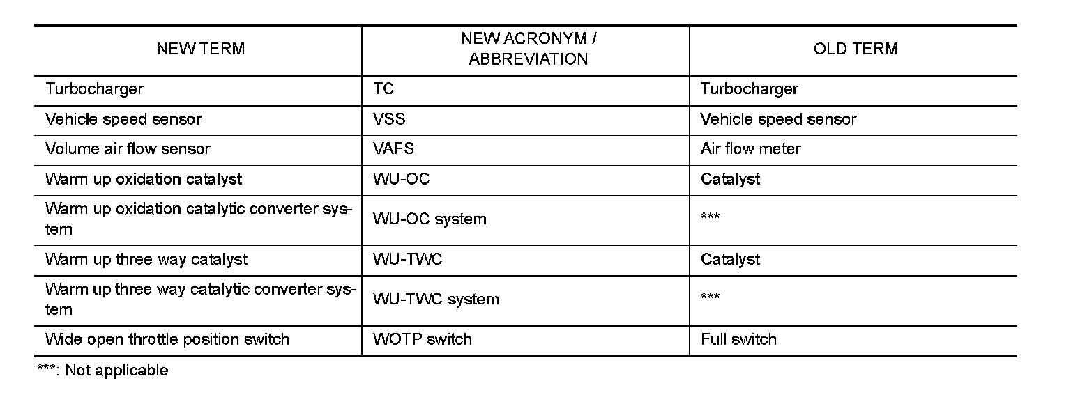 All emission related terms used in this publication in accordance with SAE J1930 are listed. Accordingly, new terms, new acronyms/abbreviations and old terms are listed in the following chart.
