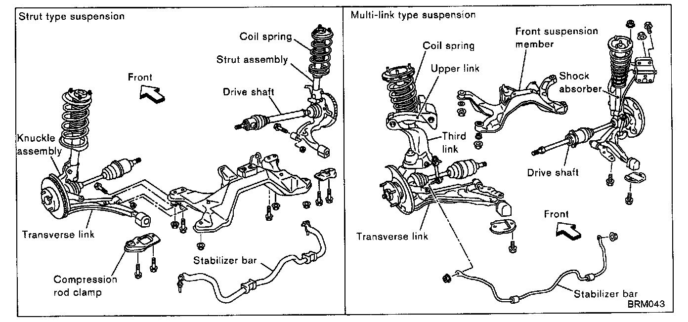 Wheel alignment inclinations must be repaired correctly to conform to design specifications. Therefore, you should understand types and installation of suspension, and should be careful when installing the suspension to repair wheel alignment inclinations. There are roughly two categories of suspensions: rigid axle type and independent type. Nissan's principal suspension types are shown as follows.