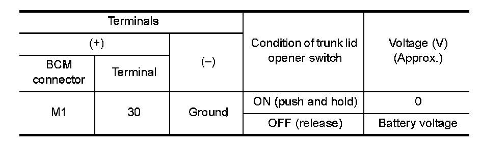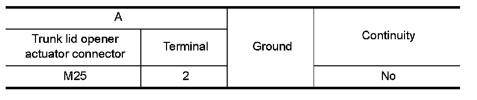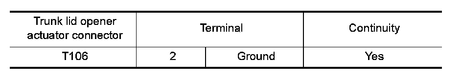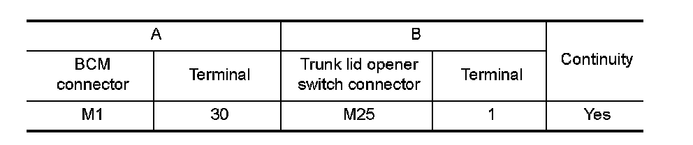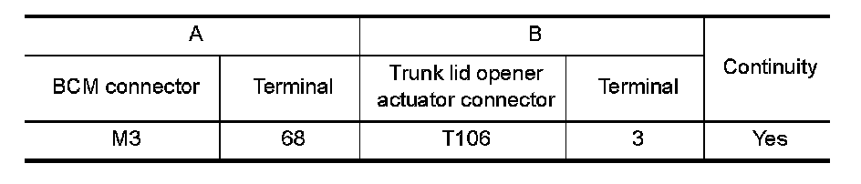 2. Check continuity between BCM connector and trunk lid opener actuator connector.