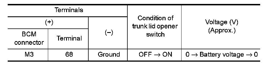 2. Check continuity between BCM connector and trunk lid opener switch connector.