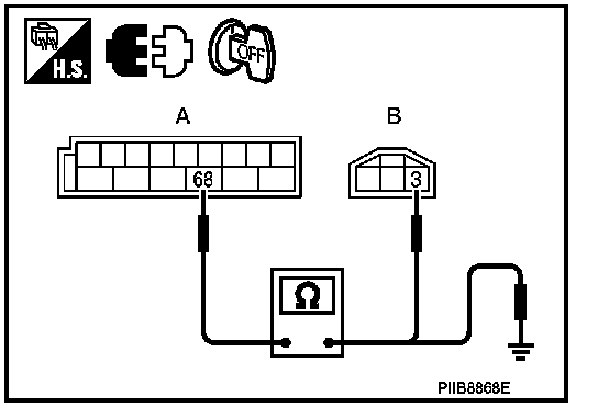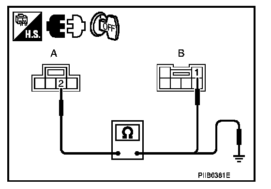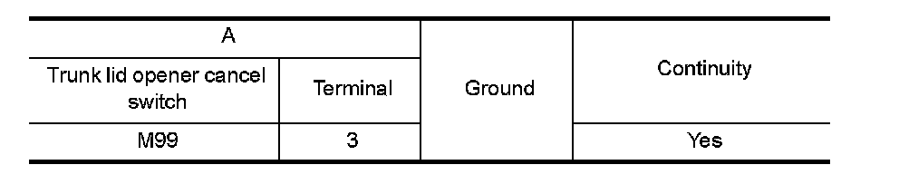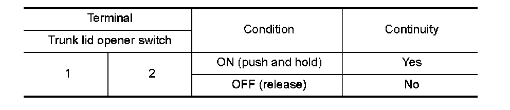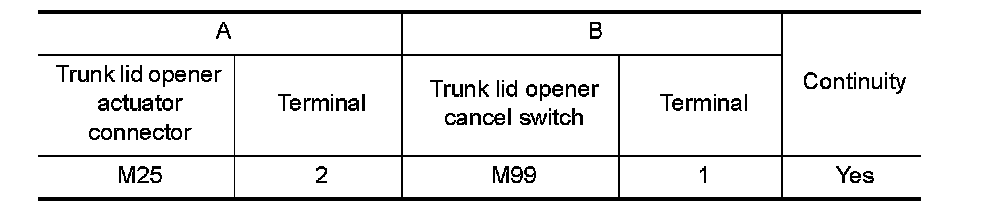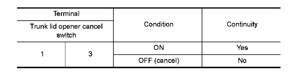 1. Check continuity between trunk lid opener switch connector and trunk lid opener cancel switch connector.