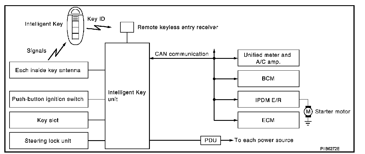 6. The steering lock unit unlocks the steering lock when receiving the signal. PDU starts the power supply distribution according to the push-button ignition switch operation when receiving the signal. If it enters the engine start permission mode, the power supply is supplied from PDU to the starter motor relay and the cranking is started.