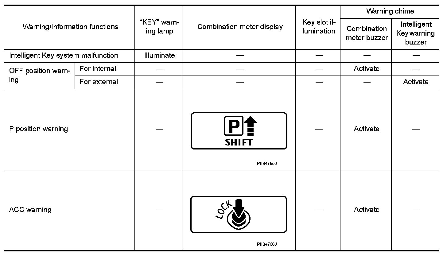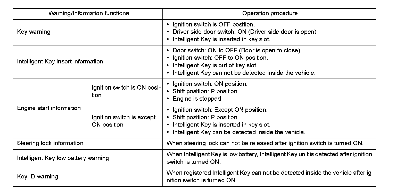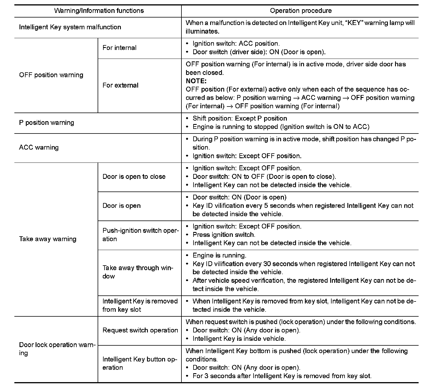 The warning function are as follows and are given to the user as warning information and warnings using combinations of Intelligent Key warning buzzer, KEY warning lamp, key slot illumination and combination meter display in combination meter.