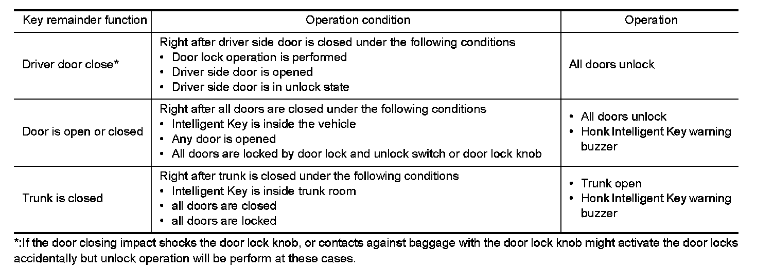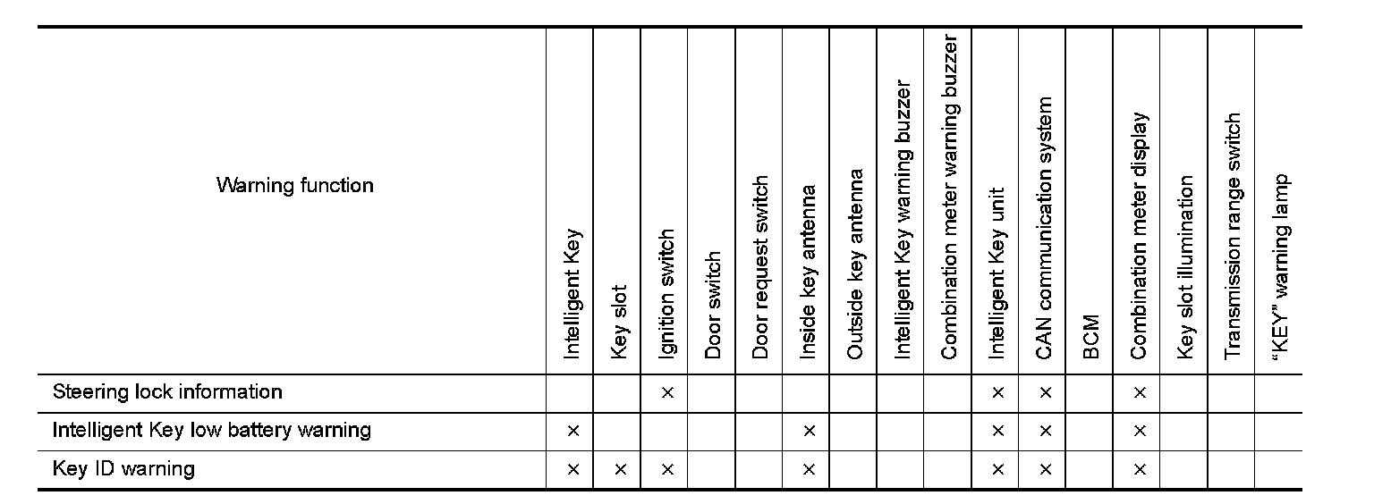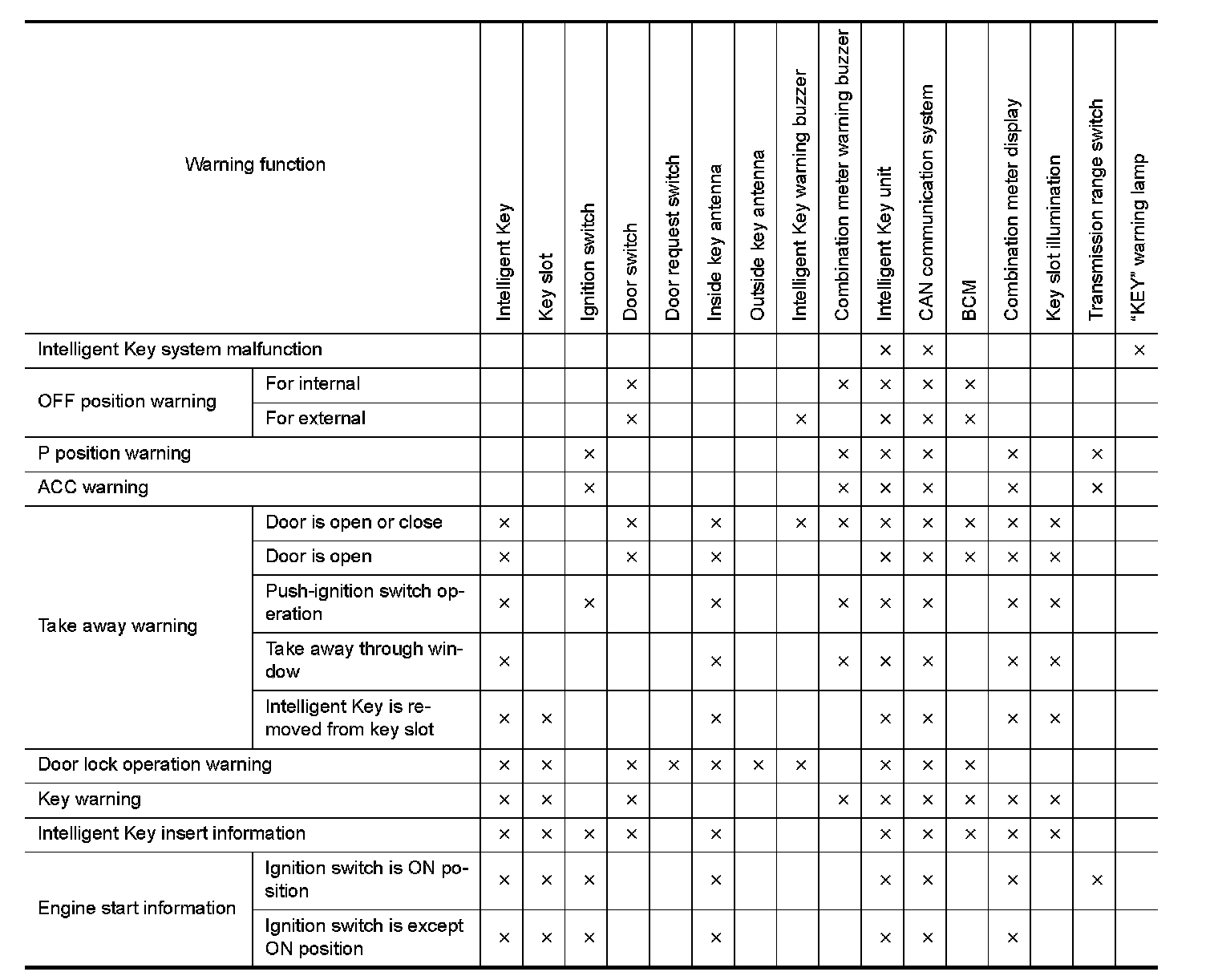 The warning function are as follows and are given to the user as warning information and warnings using combinations of Intelligent Key warning buzzer, KEY warning lamp, key slot illumination and combination meter display in combination meter.