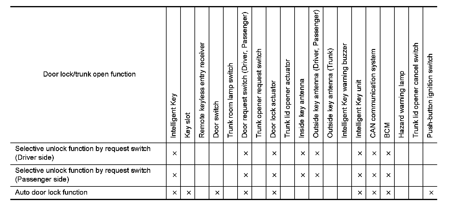 When all doors are locked, ignition switch is OFF (ignition switch is not pressed) and key switch is OFF (Intelligent Key is not inserted in key slot), doors are unlocked with Intelligent Key button. When Intelligent Key unit does not receive the following signals within 30 seconds, all doors are locked.