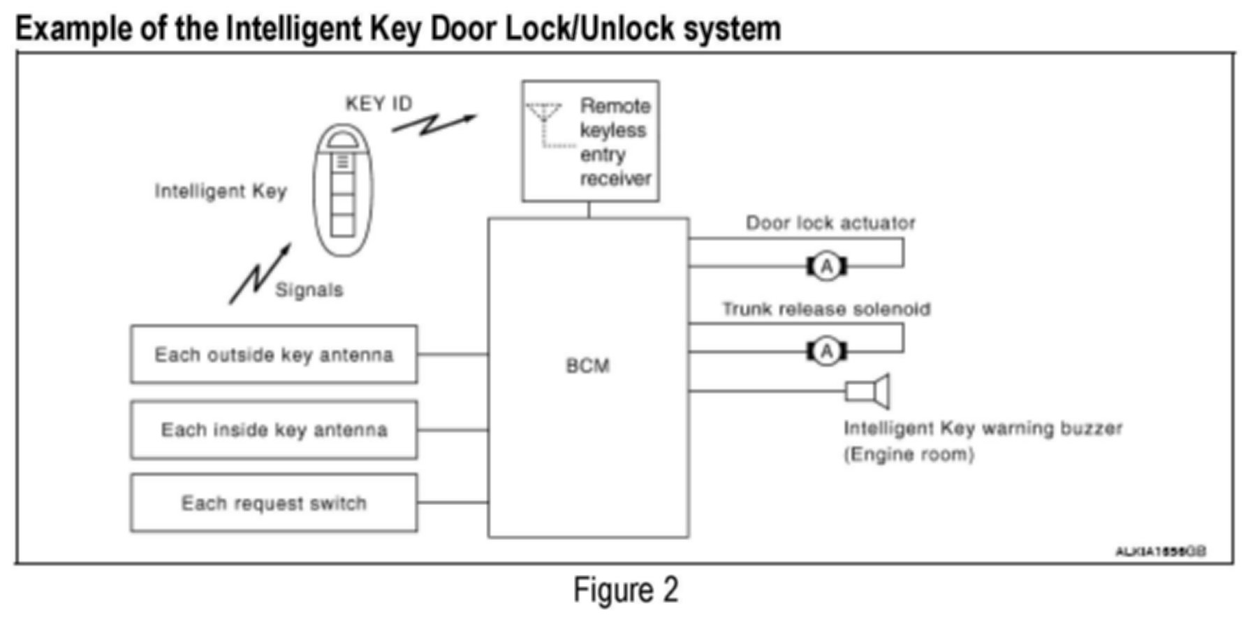The Intelligent Key door lock/unlock functions are controlled by several components. Proper diagnostic steps should be performed before replacing any part. The BCM (Body Control Module) is usually not the cause of an inoperative condition.