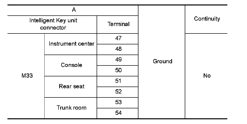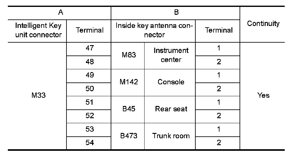 2. Check continuity between Intelligent Key unit connector and inside key antenna connector.