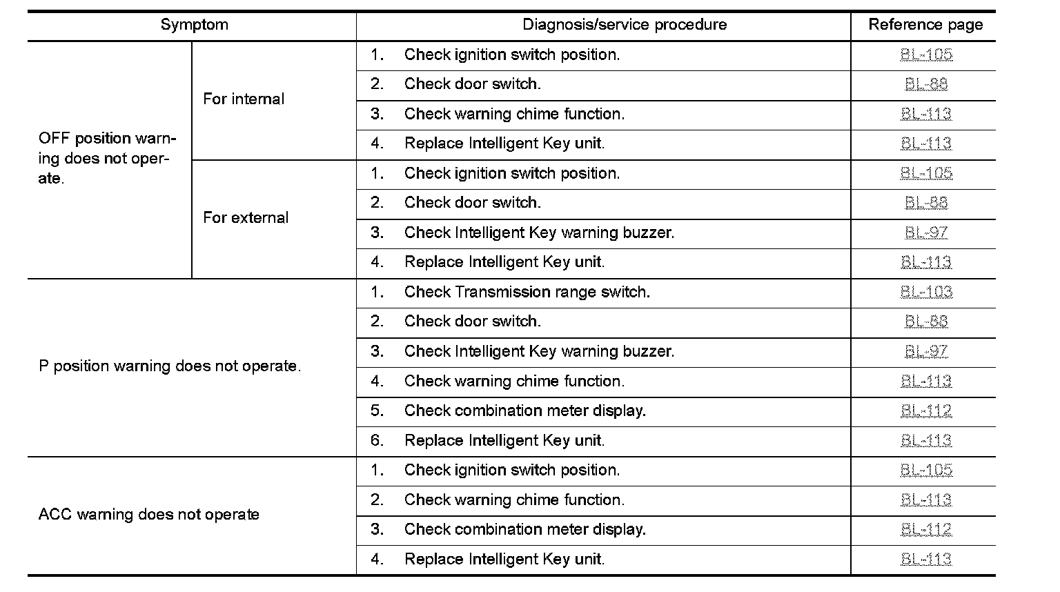 - If the following "symptoms" are detected, check systems shown in the "Diagnosis/service procedure" column in this order.