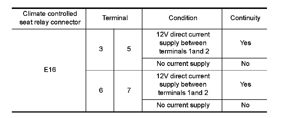 NG - Repair or replace harness between climate controlled seat relay and ground.