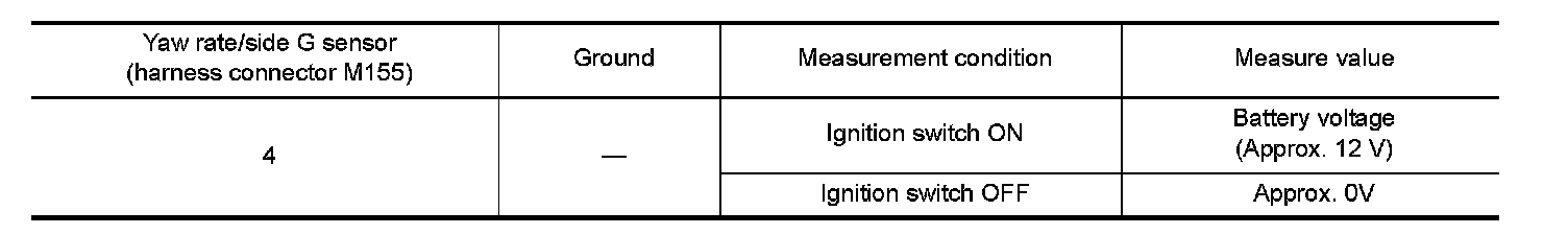 2. Turn ignition switch ON or OFF and check voltage between yaw rate/side G sensor harness connector