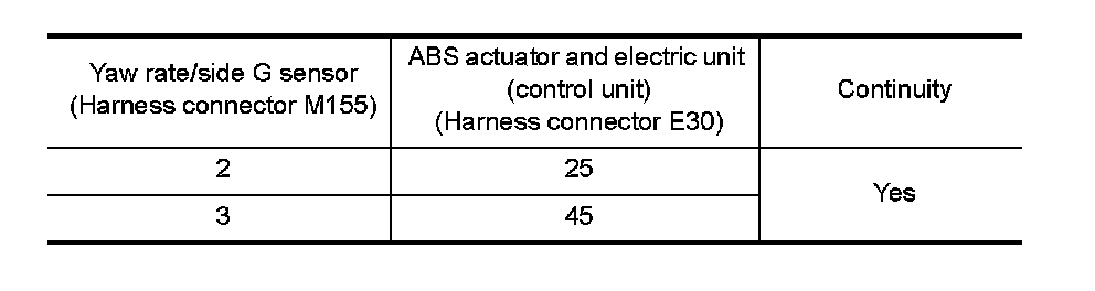 1. Turn ignition switch OFF and disconnect yaw rate/side G sensor connector M155 and ABS actuator and electric unit (control unit) connector E30, check terminal for deformation, disconnection, looseness, and so on. If any malfunction is found, repair or replace terminal.