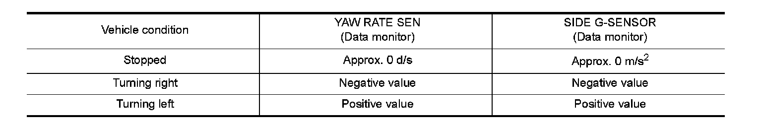 2. Select "YAW RATE SEN", "SIDE G-SENSOR" in "DATA MONITOR" and check yaw rate/side G sensor signal.
