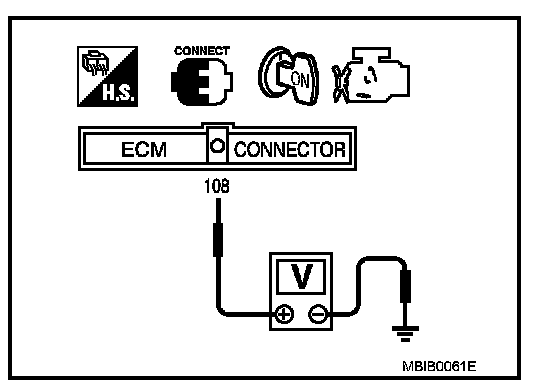 2. Check voltage between ECM terminal 108 and ground under the following conditions.
