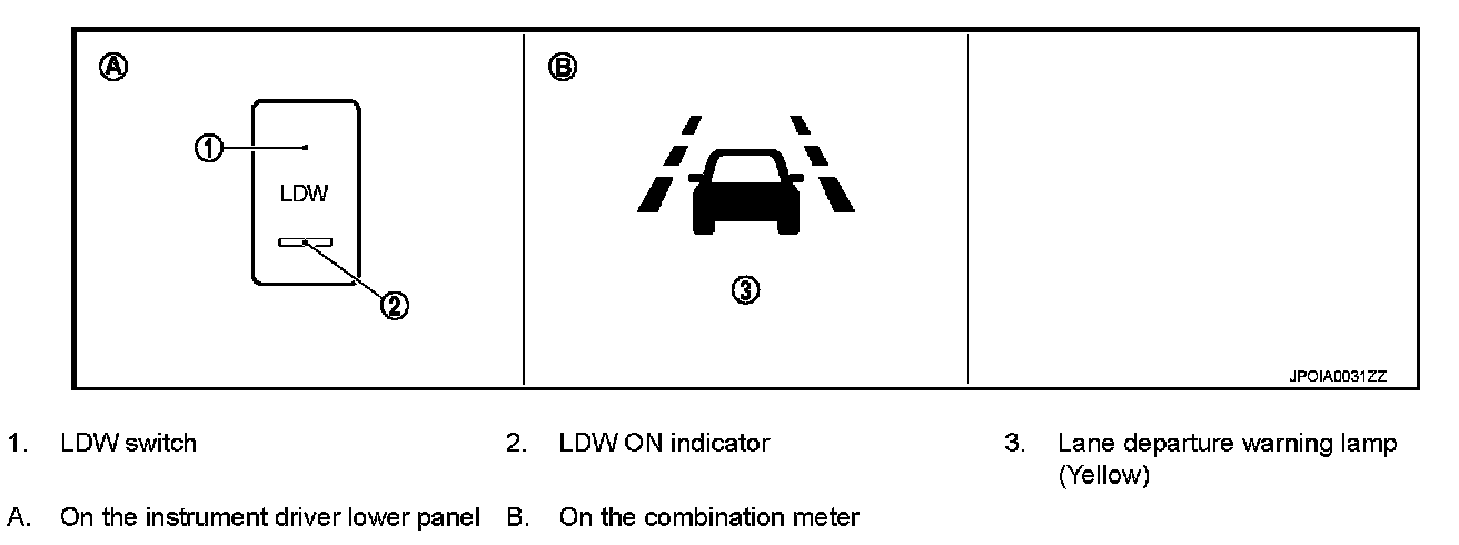 - Lane Departure Warning (LDW) system provides a lane departure warning function when the vehicle is driven at speeds of approximately 72 km/h (45 MPH) or more.