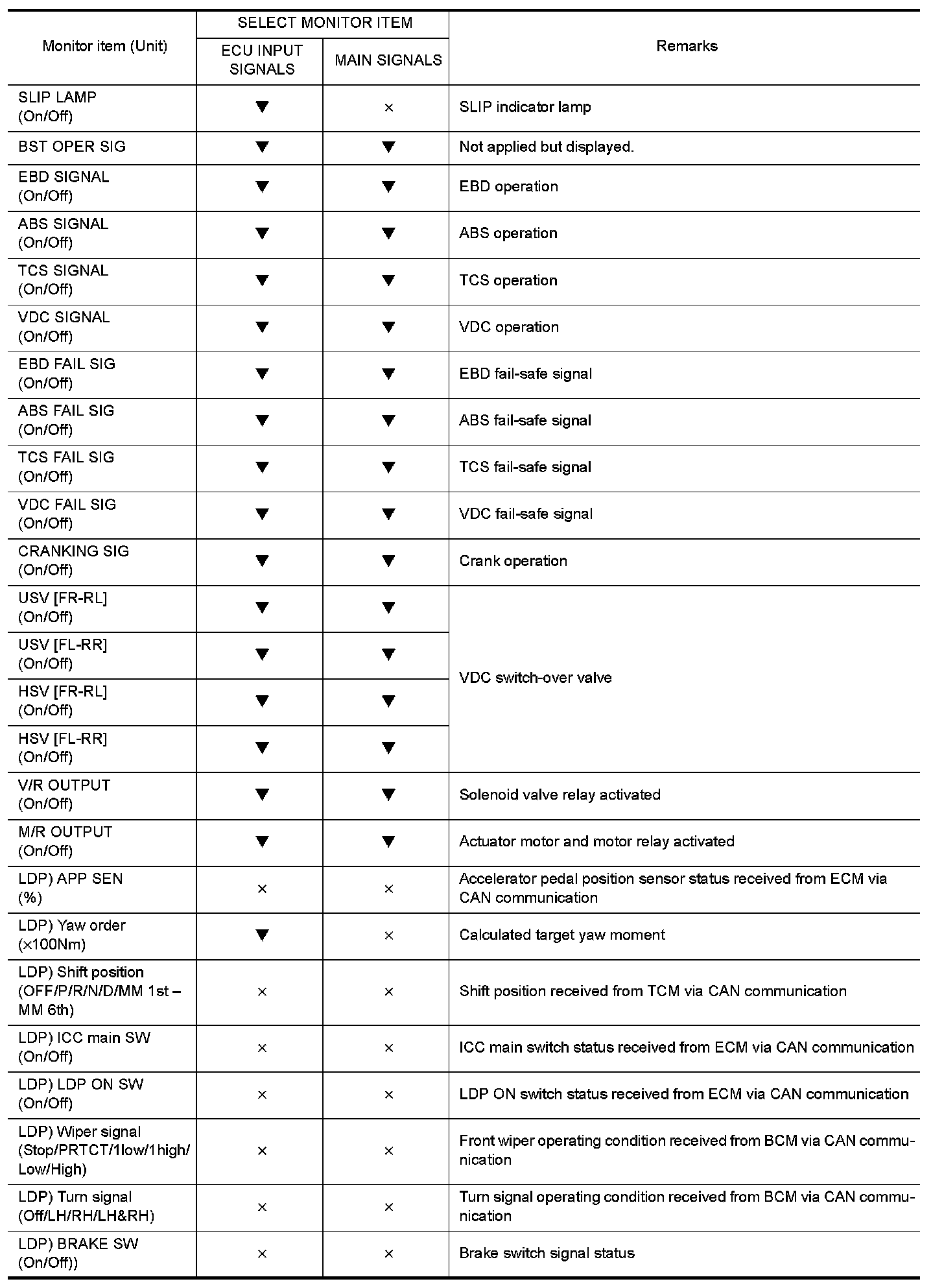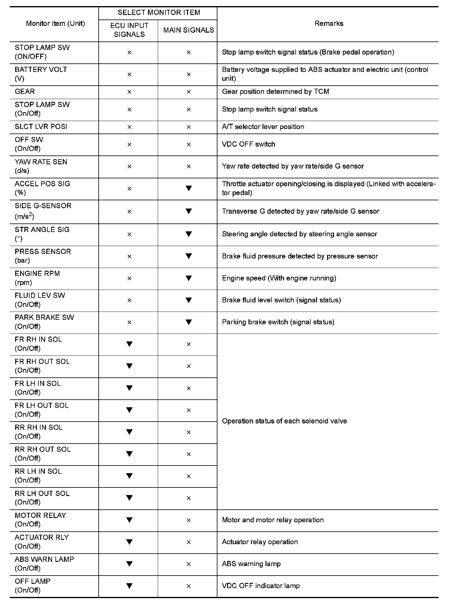 - The active test cannot be started when ABS warning lamp, VDC OFF indicator lamp, SLIP indicator lamp and brake warning lamp are ON.