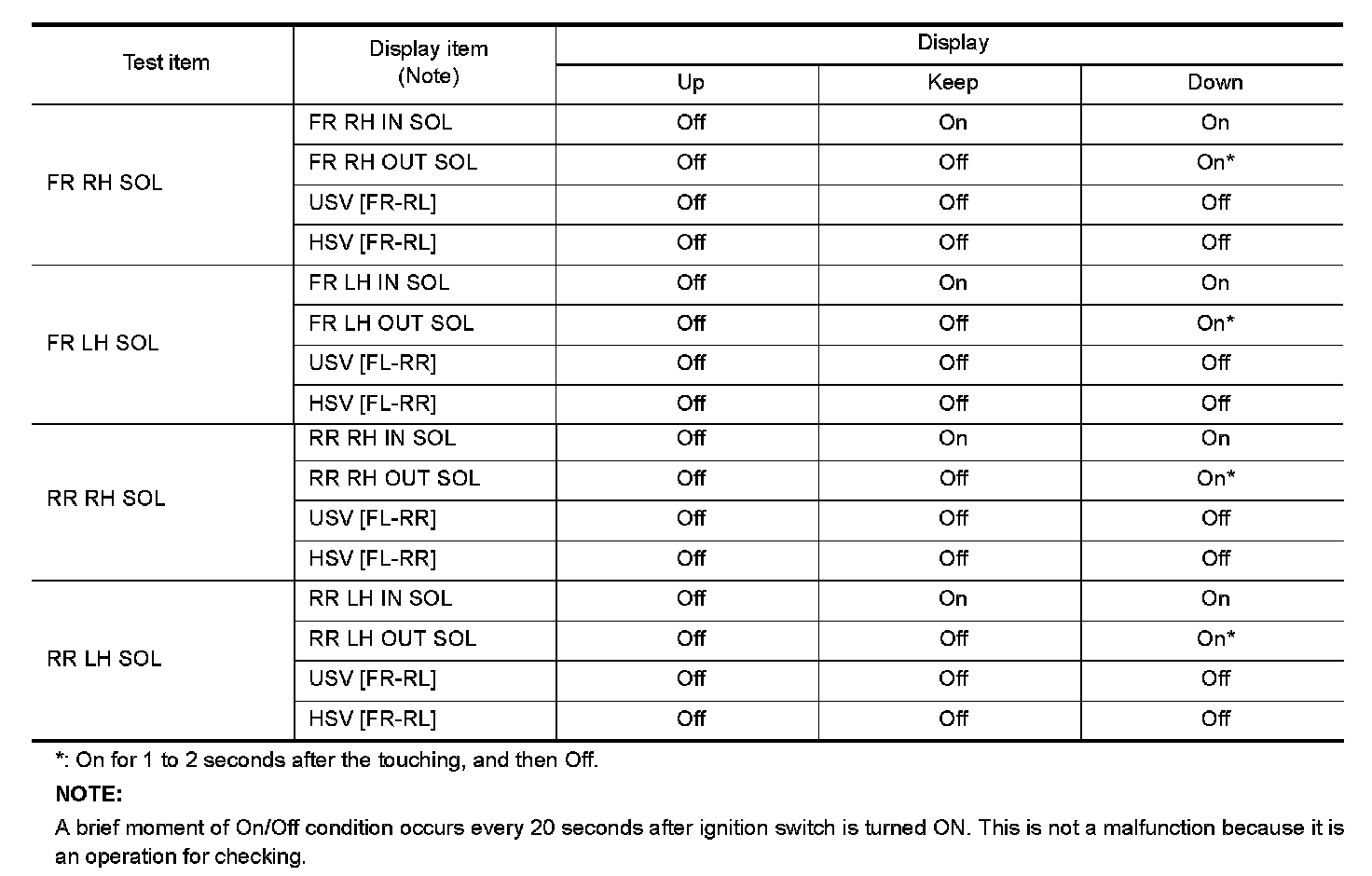- Touch "Up", "Keep" and "Down". Then use screen monitor to check that solenoid valve operates as shown in the table below.