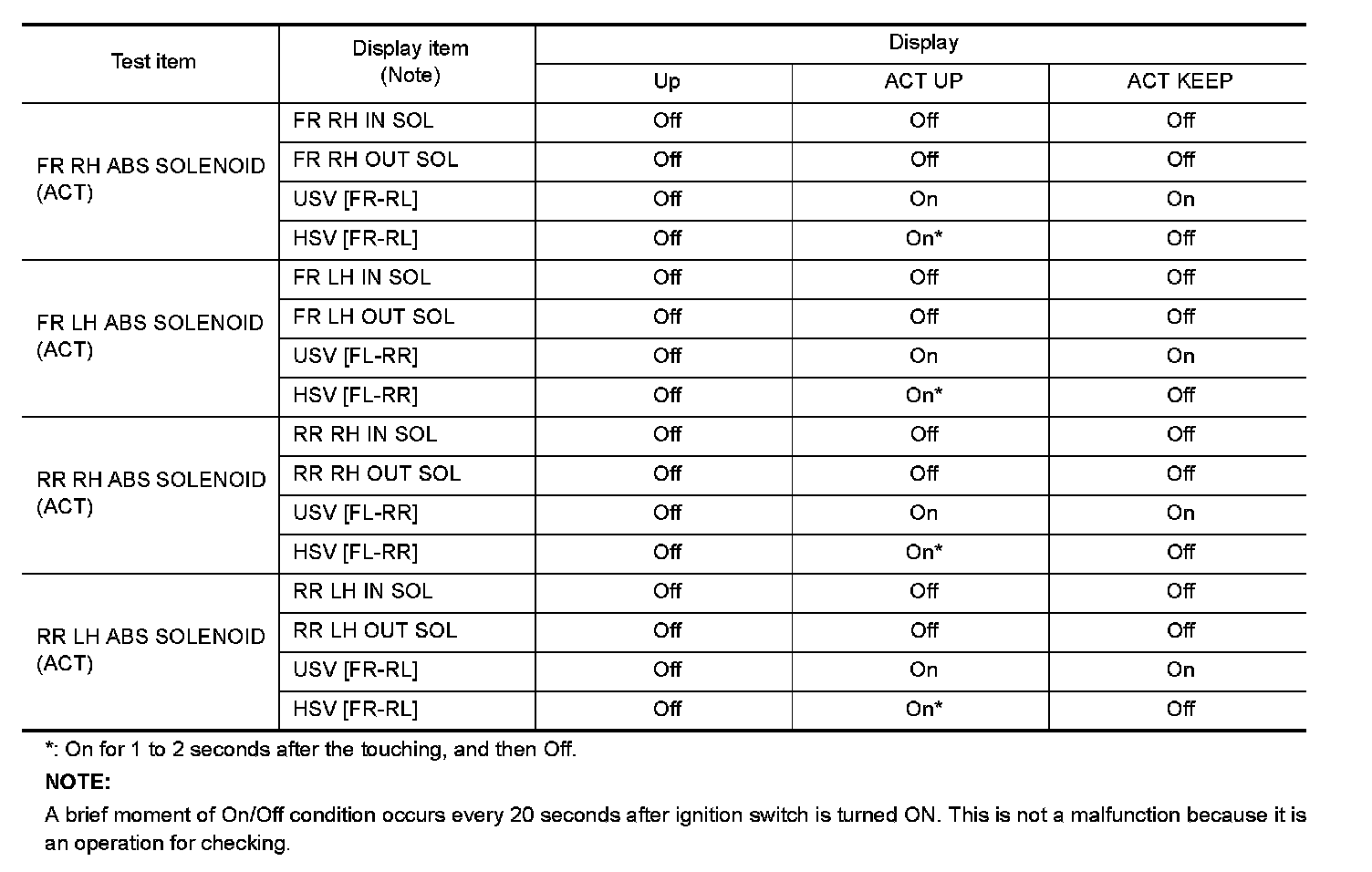 - Touch "Up", "ACT UP" and "ACT KEEP". Then use screen monitor to check that solenoid valve operates as shown in the table below.
