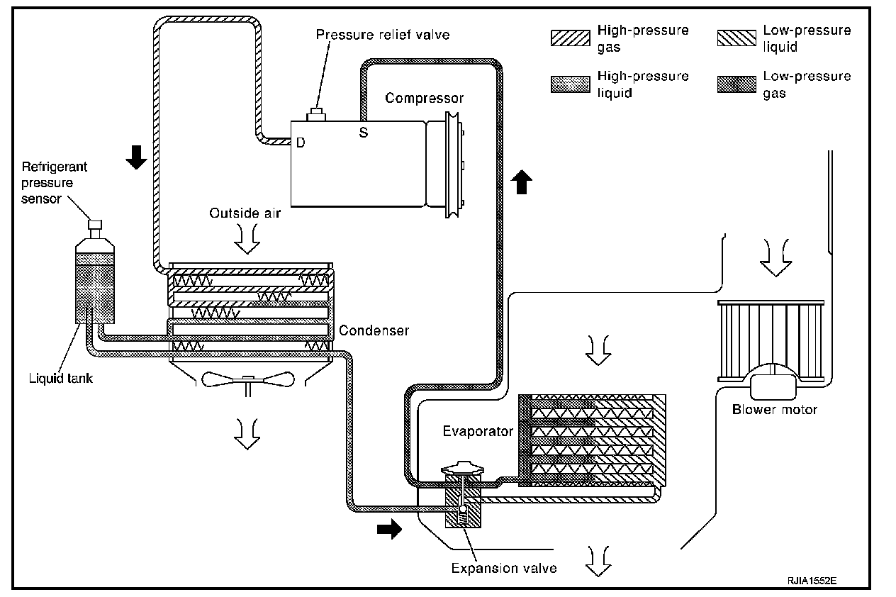 The refrigerant system is protected against excessively high- or low-pressures by the refrigerant pressure sensor, located on the liquid tank. If the system pressure rises above, or falls below the specifications, the refrigerant pressure sensor detects the pressure inside the refrigerant line and sends the voltage signal to the ECM.