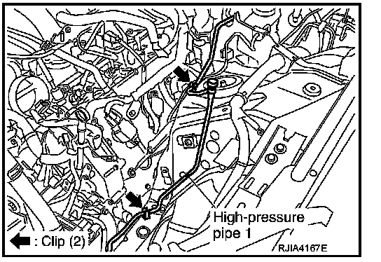 3. Remove high-pressure pipe 1 from vehicle clips.