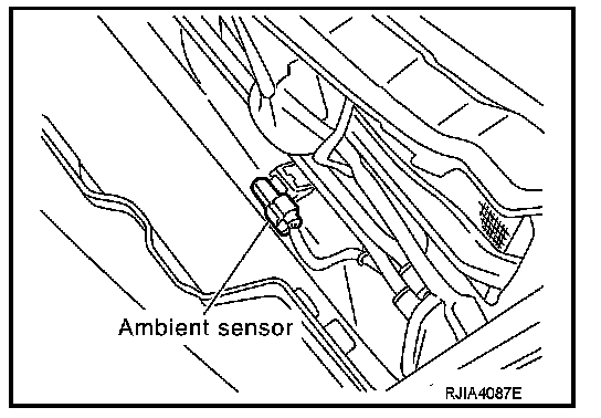 The ambient sensor is attached on the radiator core support (left side). It detects ambient temperature and converts it into a resistance value which is then input into the unified meter and A/C amp.