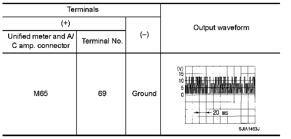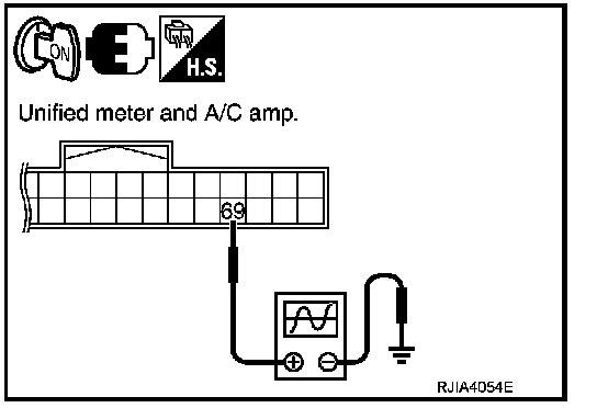 Confirm A/C LAN signal between unified meter and A/C amp. harness connector M65 terminal 69 and ground using an oscilloscope.