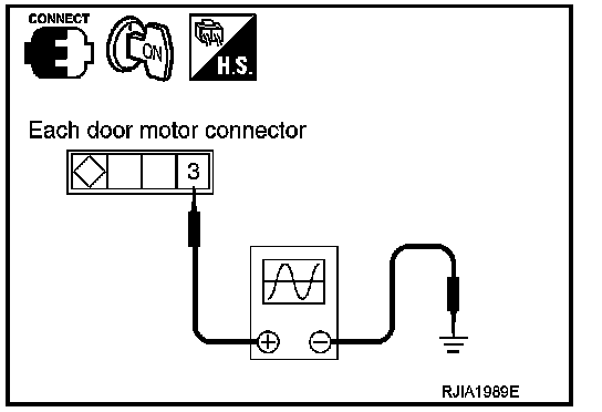 Confirm A/C LAN signal between each door motor harness connector terminal 3 and ground using an oscilloscope.