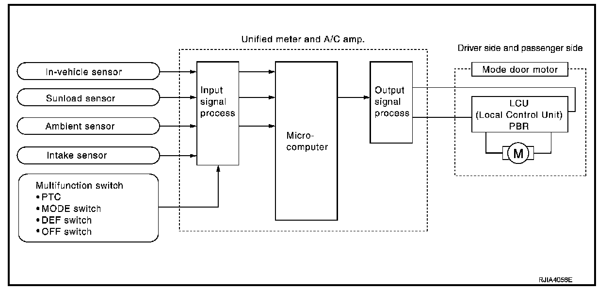 - The unified meter and A/C amp. receives data from each of the sensors. The unified meter and A/C amp. sends air mix door, mode door, upper ventilator door and intake door opening angle data to the air mix door motor LCUs, mode door motor LCUs, upper ventilator door motor LCU and intake door motor LCU.