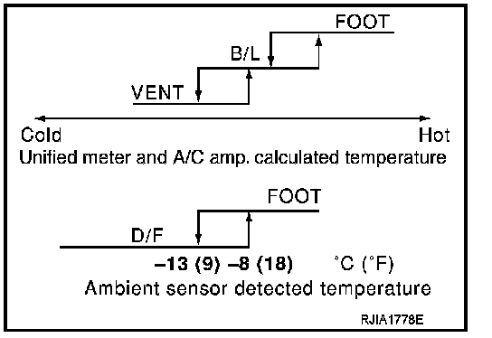 AUTO switch allows automatic control by unified meter and A/C amp. During the automatic control of mode position, a mode door position (VENT, B/L, FOOT, or D/F) is selected based on a target air mix door opening angle and sunload depending on a temperature calculated by unified meter and A/C amp. In addition, D/F is selected to prevent windshield fogging only when ambient temperature is extremely low with mode position FOOT.