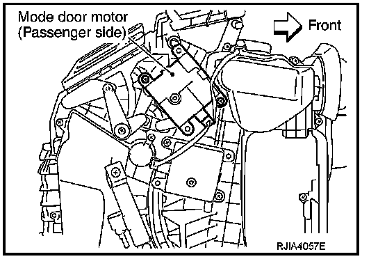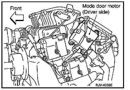 The mode door motors are attached to the heater and cooling unit assembly. It rotates so that air is discharged from the outlet set by the unified meter and A/C amp. Motor rotation is conveyed to a link which activates the mode door.
