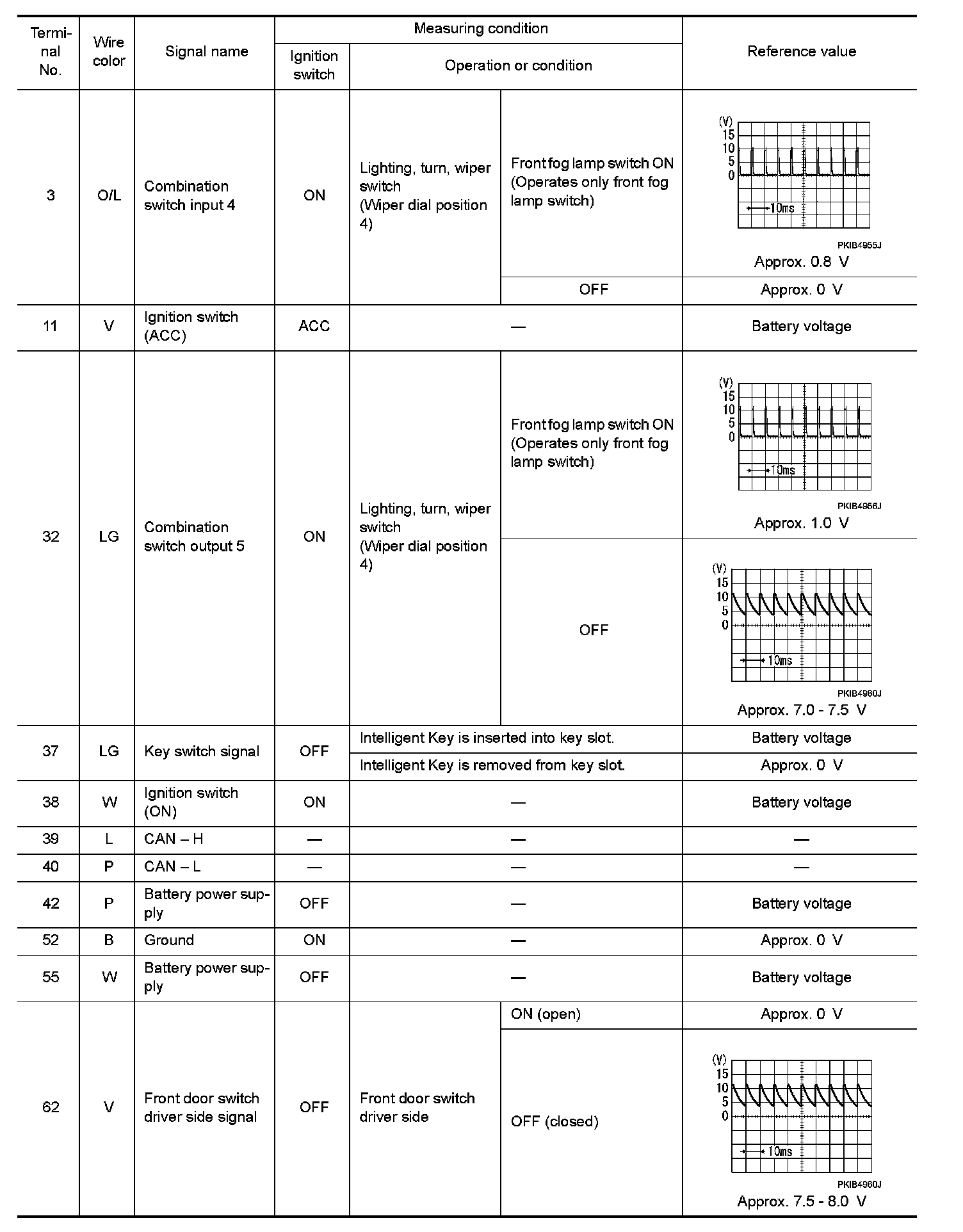 - Check combination switch system terminal waveform under the loaded condition with lighting switch, turn signal switch and wiper switch OFF not to be fluctuated by overloaded.