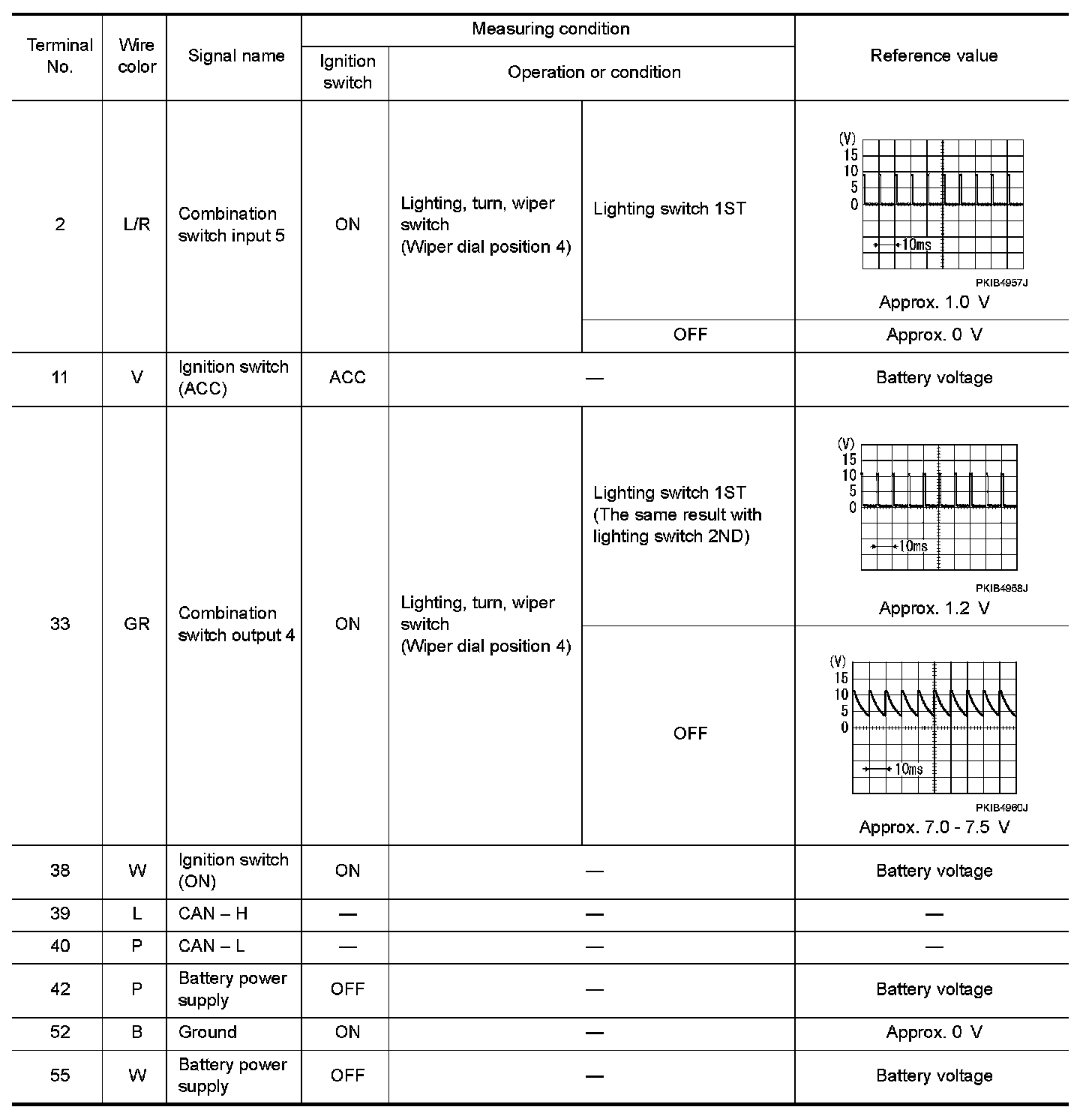 - Check combination switch system terminal waveform under the loaded condition with lighting switch, turn signal switch and wiper switch OFF not to be fluctuated by overloaded.