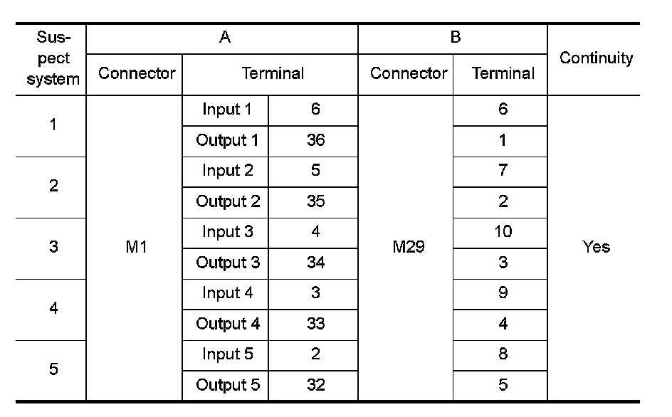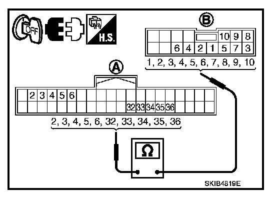 3. Check for continuity between BCM harness connector (A) of the suspect system and the corresponding combination switch connector (B).