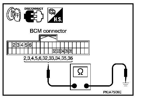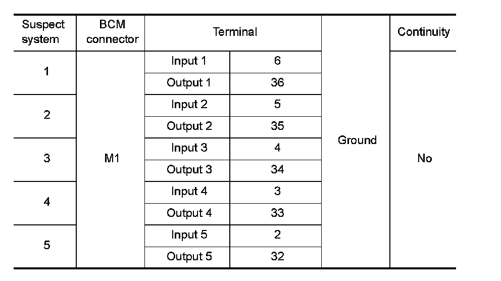 4. Check for continuity between each of BCM harness connector in suspect malfunctioning system and ground.