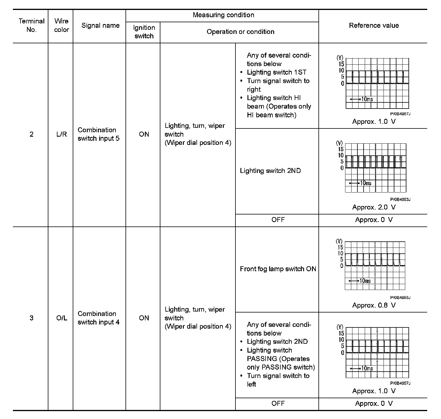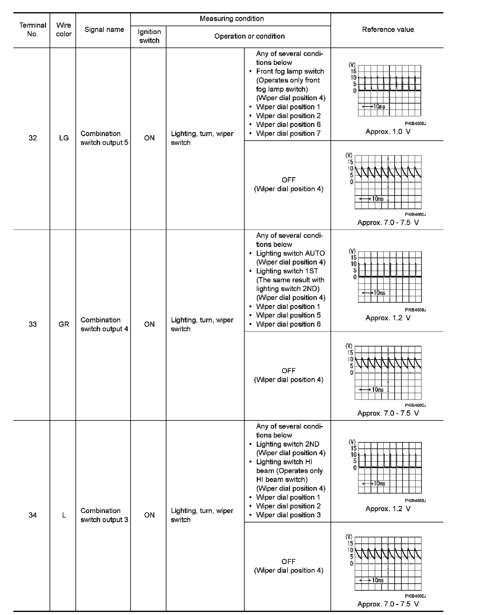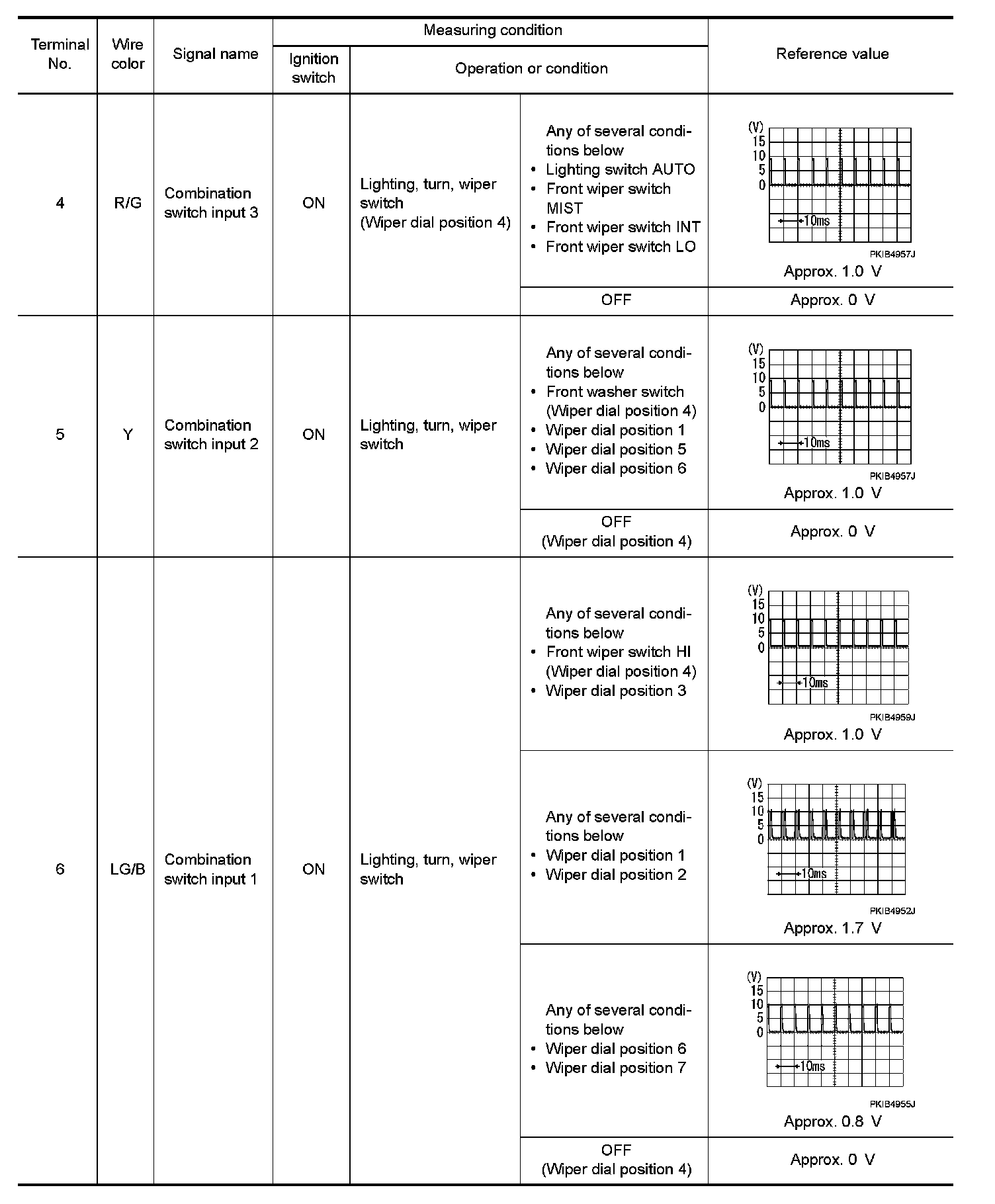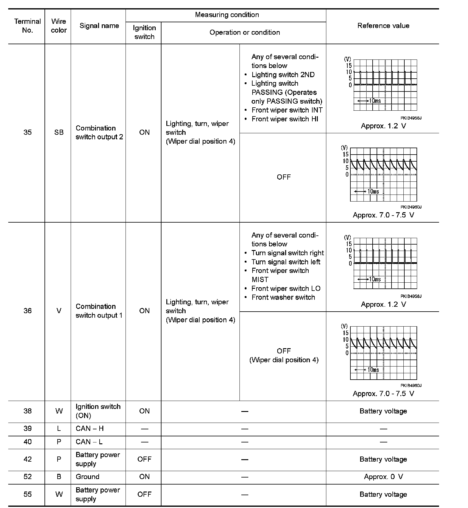- Check combination switch system terminal waveform under the loaded condition with lighting switch, turn signal switch and wiper switch OFF not to be fluctuated by overloaded.