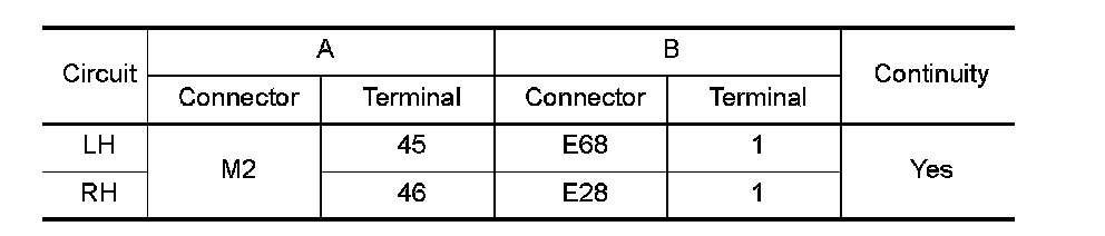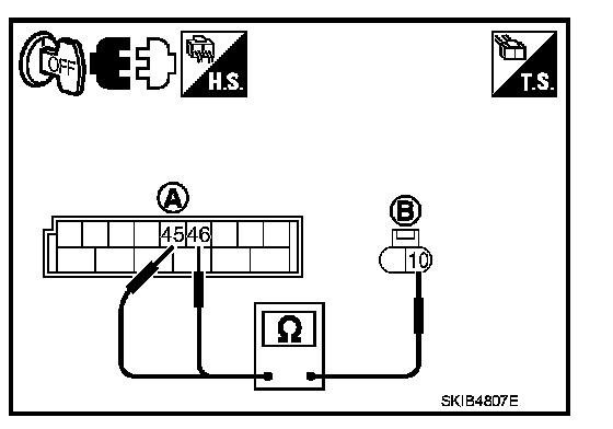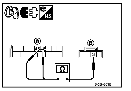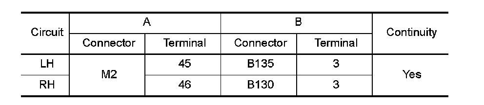 4. Check continuity between BCM harness connector (A) and side turn signal lamp (RH and LH) harness connector (B).