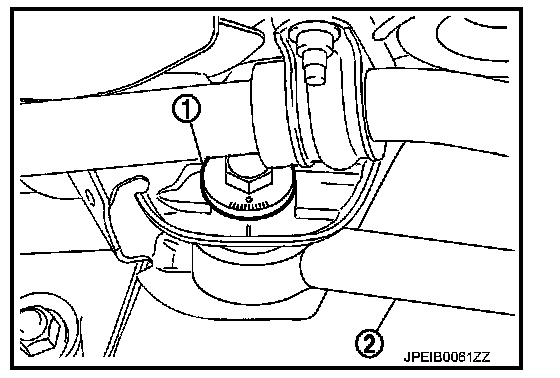 - If outside the standard value, adjust with adjusting bolt (1) in front lower link (2).