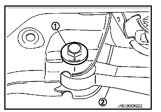If toe-in is not within the specification, adjust with adjusting bolt (1) in rear lower link (2).