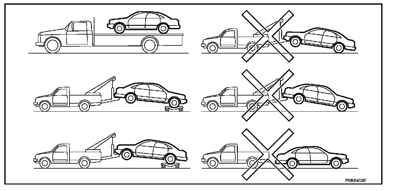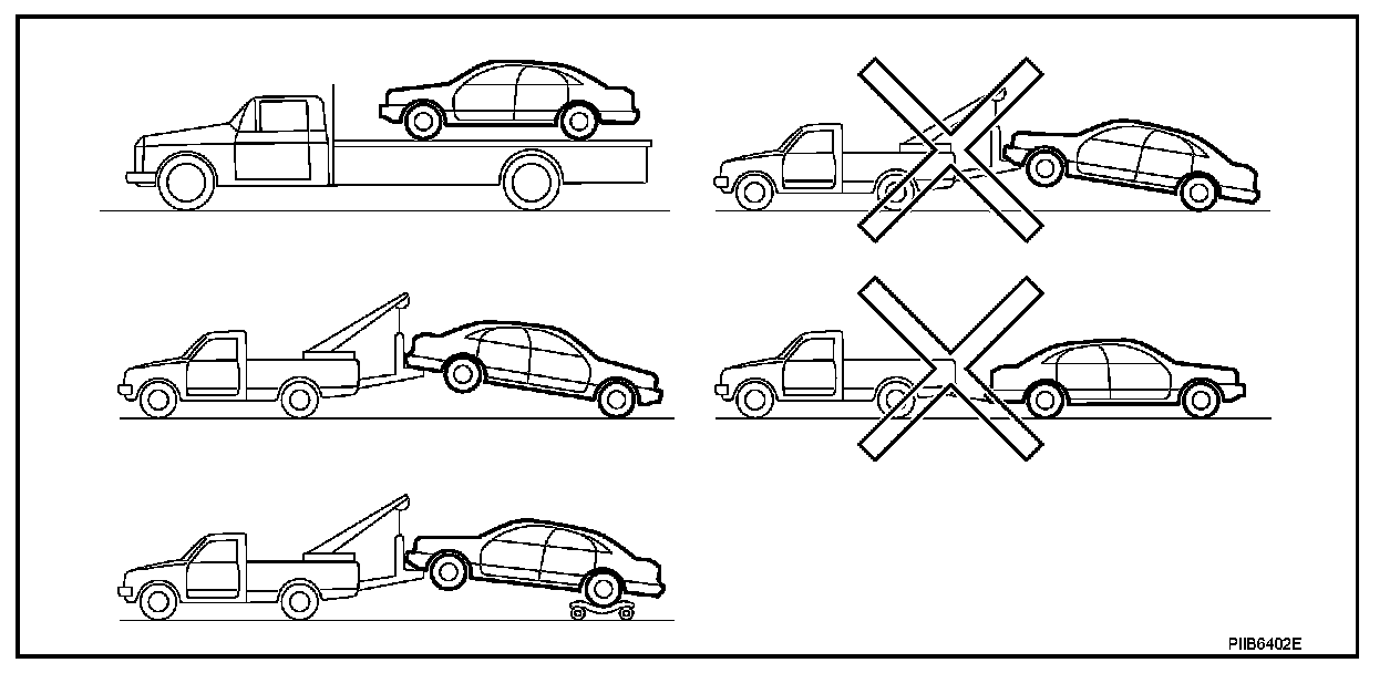 INFINITI recommends that vehicle be towed with the driving (rear) wheels off the ground or that a dolly be used as illustrated.