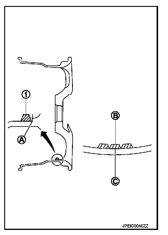 b. When installing balance weight (1) to road wheels, set it into the grooved area (A) on the inner wall of the road wheel as shown in the figure so that the balance weight center (B) is aligned with the tire balance machine indication position (angle) (C).