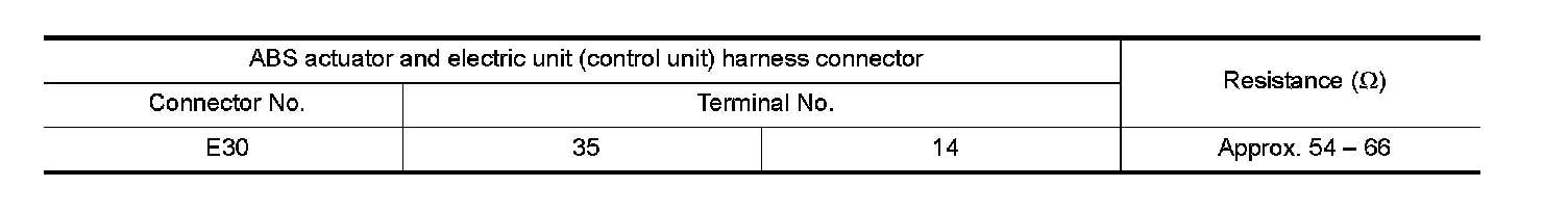 2. Check the resistance between the ABS actuator and electric unit (control unit) harness connector terminals.